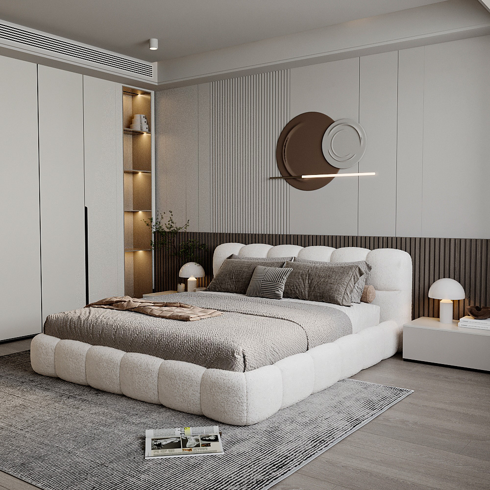 Designed as part of a bedroom filled with special pieces that make you feel warm, relaxed, and surrounded by quiet luxury. Inspired by soft bubbles, the plush, rounded edges and fully padded frame create a cozy, cloud-like feel that transforms any space into a modern and calming retreat.
