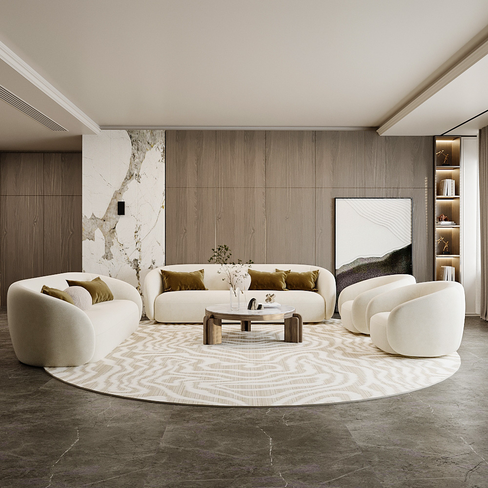 • Chair: A curved accent chair with a swivel base, mirroring the sofa’s rounded form, perfect as a statement piece.